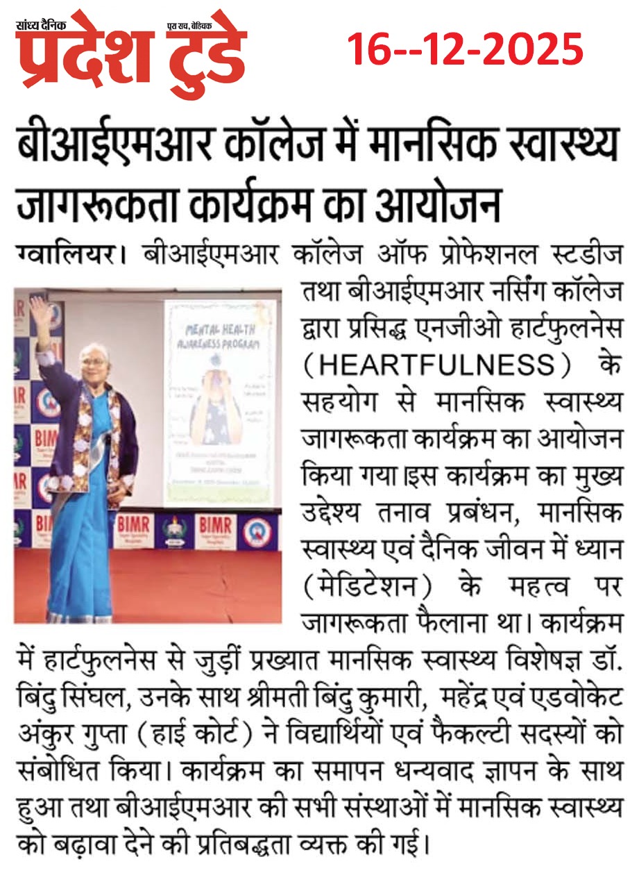 बीआईएमआर नर्सिंग महाविद्यालय में मानसिक स्वास्थय जाकरूकता कार्यक्रम हुआ । इसमें डॉ. पल्लवी शर्मा, मनोचिकित्सक...