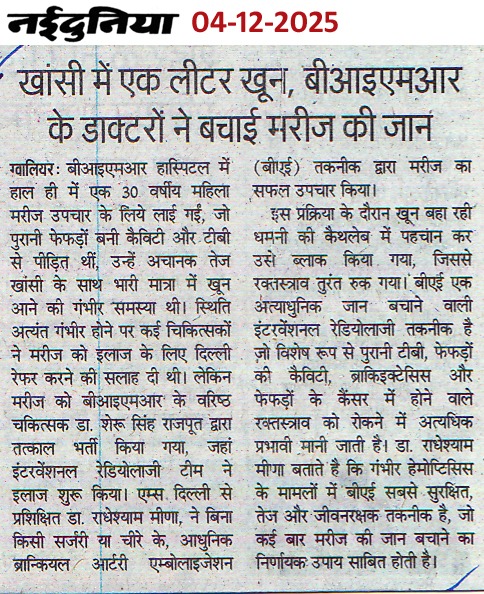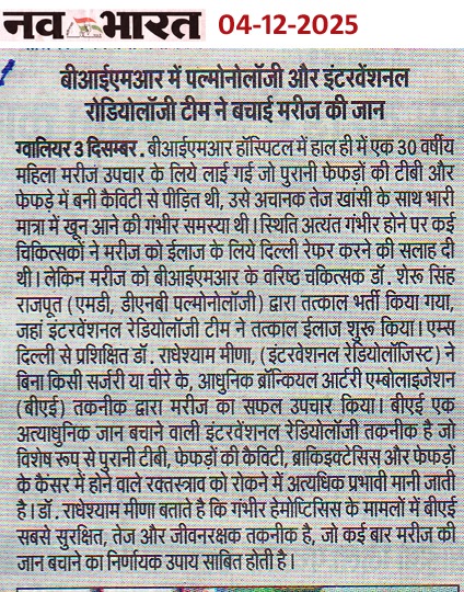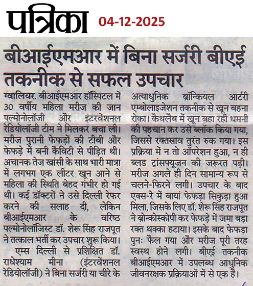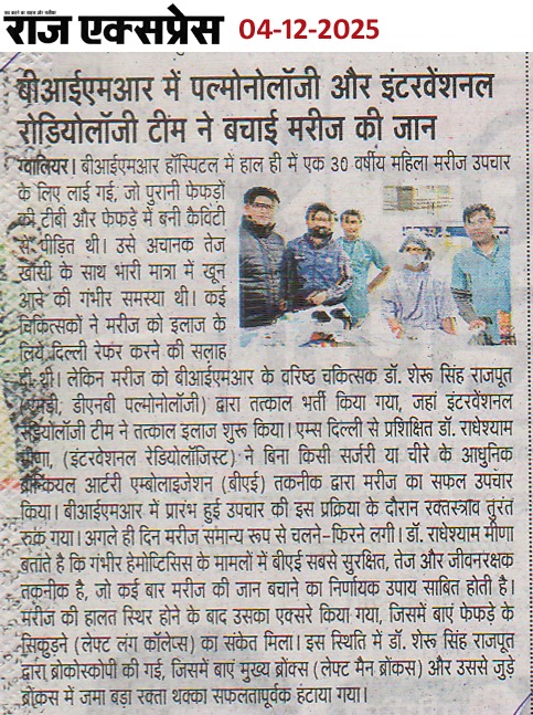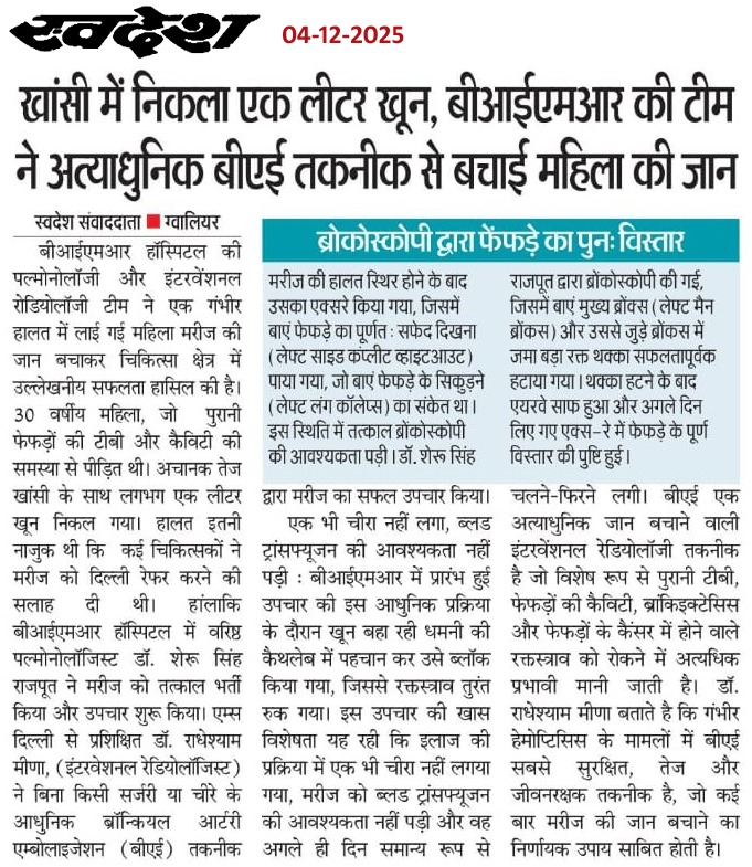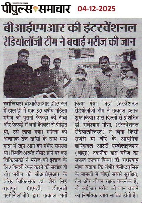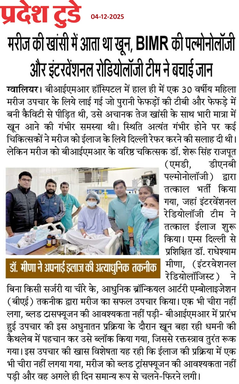 बीआईएमआर हॉस्पिटल ग्वालियर में पल्मोनोलॉजी एवं इंटरवेंशनल रेडियोलोजी की मदद से बचाई मरीज की जान विगत दिवस 30 वर्षीय एक महिला मरीज जो की पुरानी टी बी व फेफड़ें में बनी कैविटी से पीड़ित थी, अचानक तेज खांसी के साथ भारी मात्रा में खून आने की गंभीर समस्या से ग्रसित थी, गंभीर हालत में बीआईएमआर हॉस्पिटल आई। उसकी स्थिति गंभीर होने पर उसे शहर के अधिकांश चिकित्सकों ने दिल्ली रेफेर करने की सलाह दी । बीआईएमआर हॉस्पिटल में आने पर मरीज को तुरंत बीआईएमआर हॉस्पिटल के वरिष्ठ चिकित्सक डॉ. शेरू सिंह राजपूत (पल्मोलॉजिस्ट) द्वार तत्काल भर्ती किया गया व उसका इलाज शुरू किया गया । मरीज की अत्याधुनिक पद्धिति इंटरवेंशनल रेडियोलोजी की मदद से वरिष्ठ इंटरवेंशनल रेडियोलाजिस्ट डॉ. राधेश्याम मीणा के द्वारा मरीज का बिना किसी चीरे के BAE (ब्रोन्कियल Artery Embolization) प्रोसीजर द्वारा सफल उपचार किया गया जिससे मरीज का खांसी में खून आना बंद हो गया । मरीज की हालत स्थिर होने के बाद उसकी ब्रोंकोस्कोपी कर उसके फेफड़े में जमा खून के थक्के हो हटाया गया । मरीज को कुछ दिन बाद ही पूर्ण स्वस्थ अवस्था में अस्पताल से डिस्चार्ज किया गया ।