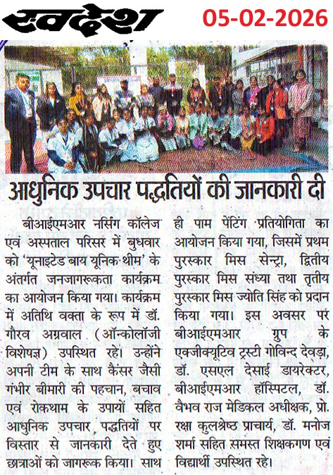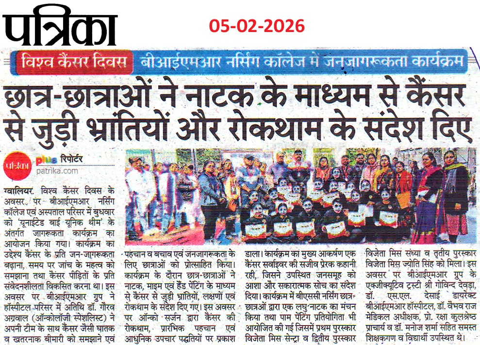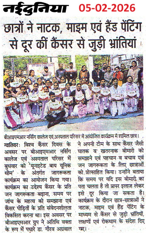 विश्व कैंसर दिवस के अवसर पर बीआईएमआर नर्सिंग कॉलेज द्वारा बीआईएमआर परिसर में "यूनाइटेड बाई यूनिक थीम" के अंतर्गत एक जागरूकता कार्यक्रम का आयोजन किया गया । इस कार्यक्रम का मुख्य उद्देश्य कैंसर के पारी जान जागरूकता बढ़ाना, समय पर जांच के महत्वा को समझना तथा कैंसर पीड़ितों के प्रति संवेदनशीलता विक्सित करना था ।