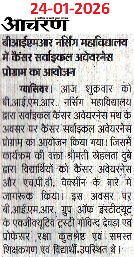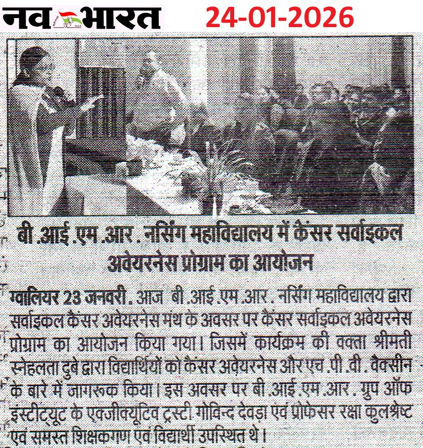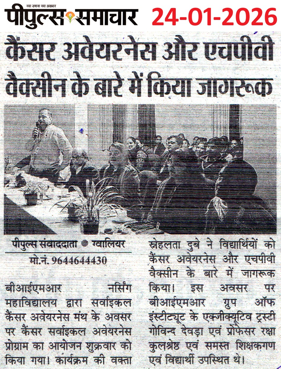 बीआईएमआर नर्सिंग महाविद्यालय में सर्वाइकल कैंसर अवेयरनेस मंथ के अवसर पर कैंसर सर्वाइकल जागरूकता कार्यक्रम का आयोजन किया गया । जिसमें मुख्य वक्ता डॉ. स्नेहलता दुबे ने विद्यार्थियों को सर्वाइकल कैंसर, उसके जोखिम और एच.पी.वी. वैक्सीन की महत्वपूर्ण जानकारी दी । कार्यक्रम में बीआईएमआर ग्रुप ऑफ़ इंस्टीटूट्स के एग्जीक्यूटिव ट्रस्टी गोविन्द देवड़ा, प्रोफ़ेसर रक्षा कुलश्रेष्ठ, शिक्षकगण और विद्यार्थी उपस्थित रहे । कार्यक्रम का उद्देश्य छात्रों में जागरूकता बढ़ाना और कैंसर रोकथाम के प्रति सतर्कता पैदा करना था । छात्रों ने उत्साहपूर्वक भाग लिया और अपने सवालों के माध्यम से जानकारी हासिल की ।