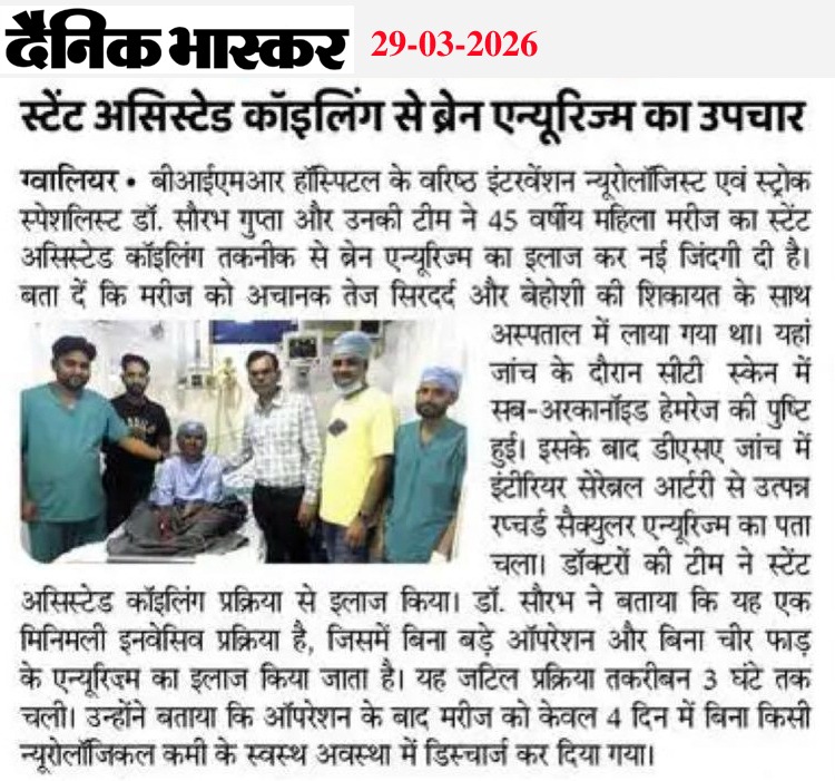 ग्वालियर में पहली बार स्टेंट असिस्टेड कॉइलिंग द्वारा ब्रेन एन्यूरिज़्म....