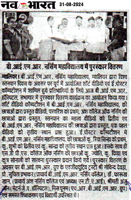 बीआईएमआर नर्सिंग महाविद्यालय द्वारा विश्व स्तनपान दिवस के अवसर पर पूर्व में आयोजित शॉर्ट वीडियो एवं ई पोस्टर कॉम्पीटीशन में शामिल हुए प्रतिभागियों के लिए शुक्रवार को बीआईएमआर अस्पताल, सभागार में पुरस्कार वितरण कार्यक्रम का आयोजन किया गया । जिसमें शॉर्ट वीडियो कॉम्पीटीशन में बीआईएमआर नर्सिंग महाविद्यालय की छात्राओं द्वारा प्रस्तुत वीडियो परवरिश को प्रथम, अंश कॉलेज आफ नर्सिंग की छात्राओं द्वारा प्रस्तुत स्तनपान का महत्व वीडियो को द्वितीय एवं बीआईएमआर नर्सिंग महाविद्यालय की छात्राओं द्वारा प्रस्तुत एक पहल वीडियो को तृतीय स्थान प्राप्त हुआ । वही ई पोस्टर कॉम्पीटीशन में बीआईएमआर नर्सिंग महाविद्यालय की छात्राओं रिया सिन्हा को प्रथम, शुभी को द्वितीय एवं सांद्रा को तृतीय तृतीय स्थान प्राप्त हुआ । पुरस्कार वितरण के अवसर पर बीआईएमआर ग्रुप के एक्जीक्यूटिव ट्रस्टी गोविंद देवड़ा, प्रोफेसर सुचिता प्रभाकर प्राचार्या बीआईएमआर नर्सिंग कॉलेज, डॉक्टर फारूख खान प्राचार्य अंश नर्सिंग कॉलेज एवं अध्यक्ष एन.टी.ए.आई., अंजू जॉन मेटर्न जे.ए. हॉस्पिटल, पूनम एचआर बीआईएमआर ग्रुप एवं समस्त शिक्षक गण एवं विद्यार्थी उपस्थित थे।