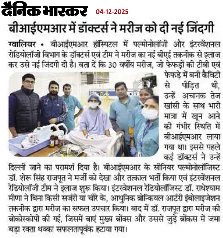 बीआईएमआर हॉस्पिटल ग्वालियर में पल्मोनोलॉजी एवं इंटरवेंशनल रेडियोलोजी की मदद से बचाई मरीज की जान विगत दिवस 30 वर्षीय एक महिला मरीज जो की पुरानी टी बी व फेफड़ें में बनी कैविटी से पीड़ित थी, अचानक तेज खांसी के साथ भारी मात्रा में खून आने की गंभीर समस्या से ग्रसित थी, गंभीर हालत में बीआईएमआर हॉस्पिटल आई। उसकी स्थिति गंभीर होने पर उसे शहर के अधिकांश चिकित्सकों ने दिल्ली रेफेर करने की सलाह दी । बीआईएमआर हॉस्पिटल में आने पर मरीज को तुरंत बीआईएमआर हॉस्पिटल के वरिष्ठ चिकित्सक डॉ. शेरू सिंह राजपूत (पल्मोलॉजिस्ट) द्वार तत्काल भर्ती किया गया व उसका इलाज शुरू किया गया । मरीज की अत्याधुनिक पद्धिति इंटरवेंशनल रेडियोलोजी की मदद से वरिष्ठ इंटरवेंशनल रेडियोलाजिस्ट डॉ. राधेश्याम मीणा के द्वारा मरीज का बिना किसी चीरे के BAE (ब्रोन्कियल Artery Embolization) प्रोसीजर द्वारा सफल उपचार किया गया जिससे मरीज का खांसी में खून आना बंद हो गया । मरीज की हालत स्थिर होने के बाद उसकी ब्रोंकोस्कोपी कर उसके फेफड़े में जमा खून के थक्के हो हटाया गया । मरीज को कुछ दिन बाद ही पूर्ण स्वस्थ अवस्था में अस्पताल से डिस्चार्ज किया गया ।