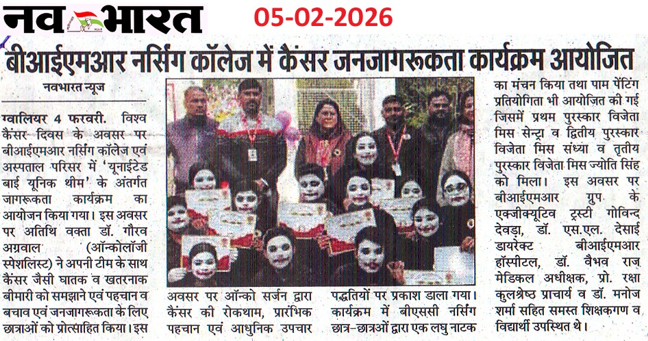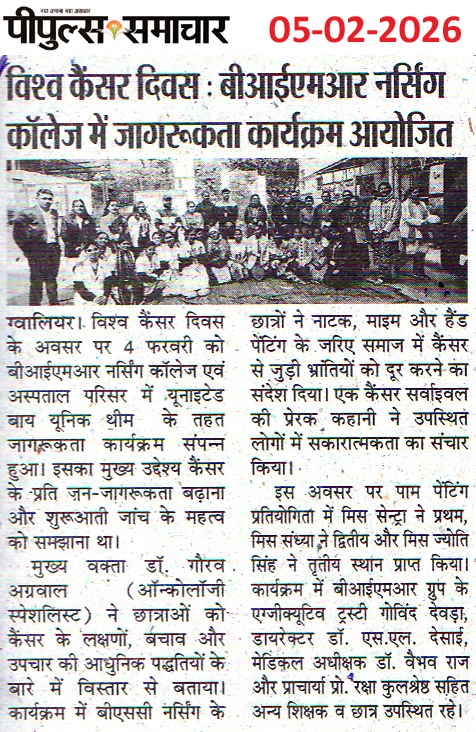 विश्व कैंसर दिवस के अवसर पर बीआईएमआर नर्सिंग कॉलेज द्वारा बीआईएमआर परिसर में "यूनाइटेड बाई यूनिक थीम" के अंतर्गत एक जागरूकता कार्यक्रम का आयोजन किया गया । इस कार्यक्रम का मुख्य उद्देश्य कैंसर के पारी जान जागरूकता बढ़ाना, समय पर जांच के महत्वा को समझना तथा कैंसर पीड़ितों के प्रति संवेदनशीलता विक्सित करना था ।