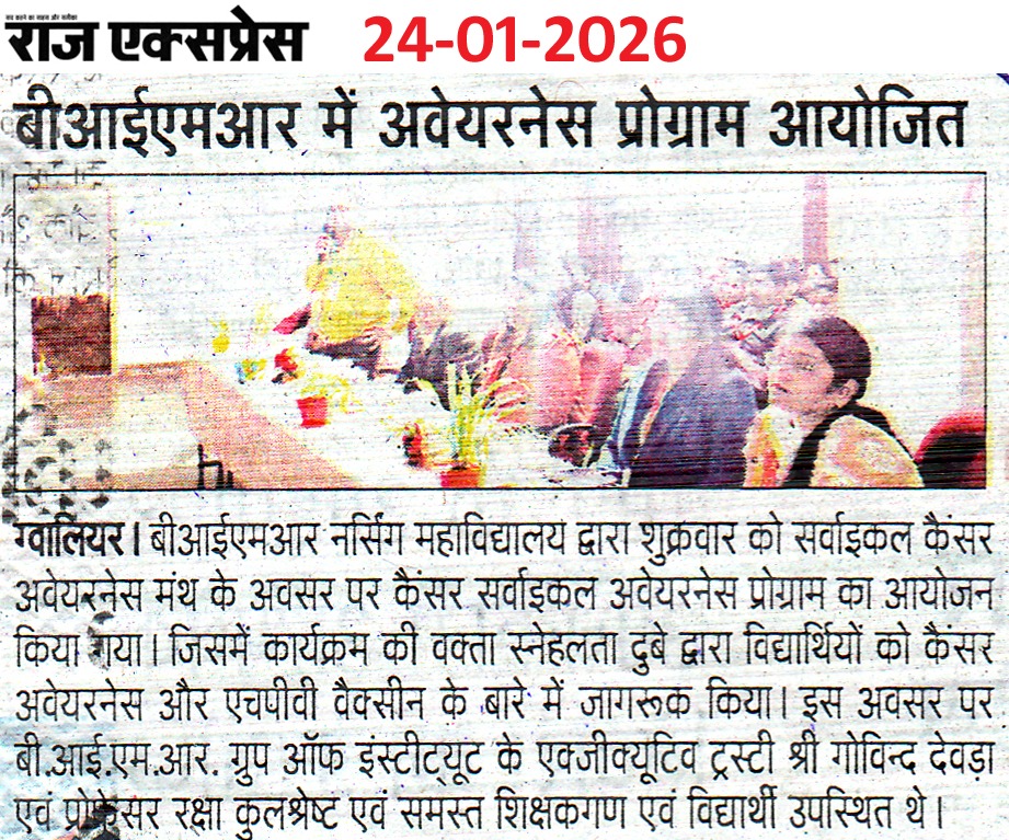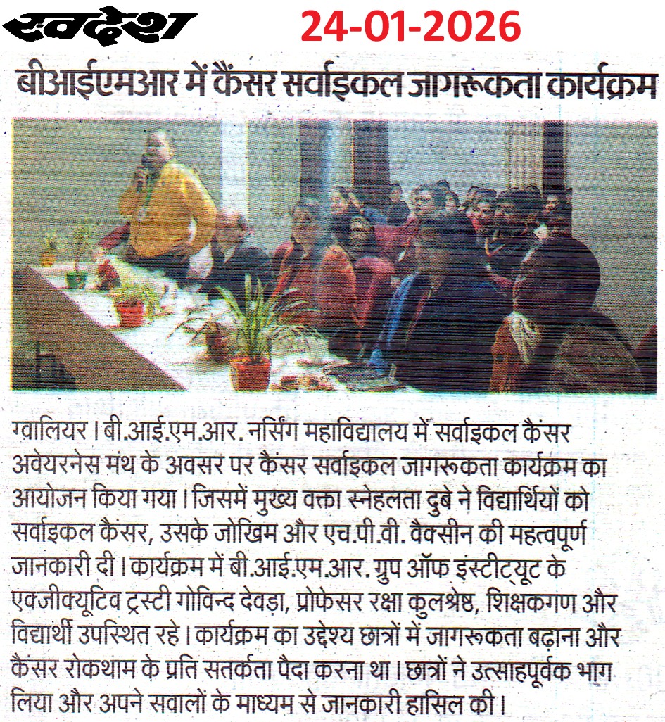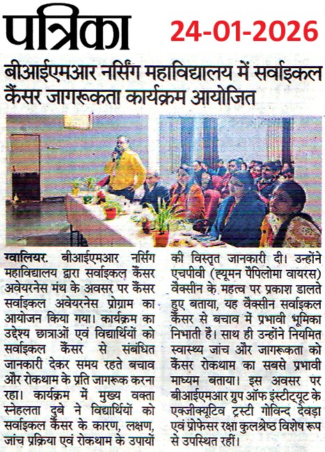 बीआईएमआर नर्सिंग महाविद्यालय में सर्वाइकल कैंसर अवेयरनेस मंथ के अवसर पर कैंसर सर्वाइकल जागरूकता कार्यक्रम का आयोजन किया गया । जिसमें मुख्य वक्ता डॉ. स्नेहलता दुबे ने विद्यार्थियों को सर्वाइकल कैंसर, उसके जोखिम और एच.पी.वी. वैक्सीन की महत्वपूर्ण जानकारी दी । कार्यक्रम में बीआईएमआर ग्रुप ऑफ़ इंस्टीटूट्स के एग्जीक्यूटिव ट्रस्टी गोविन्द देवड़ा, प्रोफ़ेसर रक्षा कुलश्रेष्ठ, शिक्षकगण और विद्यार्थी उपस्थित रहे । कार्यक्रम का उद्देश्य छात्रों में जागरूकता बढ़ाना और कैंसर रोकथाम के प्रति सतर्कता पैदा करना था । छात्रों ने उत्साहपूर्वक भाग लिया और अपने सवालों के माध्यम से जानकारी हासिल की ।