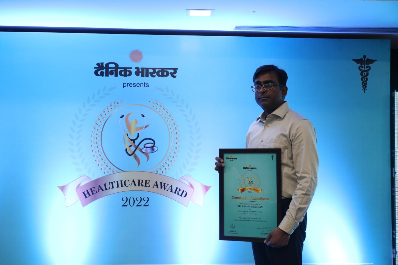 An event organised by Daink Bhasker " Healthcare Award 2022" on 11/03/2022 was graced by Shrimany jyotiraditya M. Scindia Hon. Union Minister of Civil Aviation. Govt of India.From BIMR Hospitals Dr. Abhishek Chauhan, Neuro Surgeon, Dr. Ashish Chauhan, Cardiologist, Dr. Raghvendra Updhyay, Dy. Medical Superintendent & Intensivist and Dr. Saurabh Gupta, Neurologist were awarded.