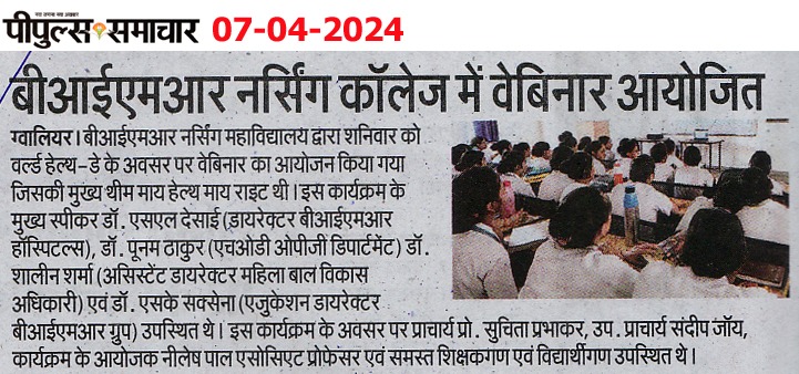 दिनांक 07 अप्रैल 2024 को बीआईएमआर नर्सिंग कॉलेज में वर्ल्ड हेल्थ-डे के अवसर पर बेविनार का आयोजन किया गया । जिसकी थीम "माय हेल्थ माय राईट" थी । इस कार्यक्रम के मुख्य स्पीकर डॉ. एस. एल. देसाई (डायरेक्टर, बीआईएमआर हॉस्पिटल्स), डॉ. पूनम ठाकुर (एचओडी, ओपीजी डिपार्टमेंट), डॉ. शालीन शर्मा (असिस्टेंट डायरेक्टर, महिला बाल विकास अधिकारी) एवं डॉ. एस. के. सक्सेना (एजुकेशन डायरेक्टर बीआईएमआर ग्रुप) उपस्थित थे । इन्होने गुणवत्ता पूर्ण देखभाल. सहमति पत्र, उपचार की गोपनीयता एवं शारीरिक स्वायत्तता के बारे में बताया । इस कार्यक्रम के अवसर पर प्राचार्या प्रो. सुचिता प्रभाकर, उप. प्राचार्य संदीप जॉय, नीलेश पाल एवं समस्त शिक्षकगण एवं विद्यार्थीगण उपस्थित थे ।