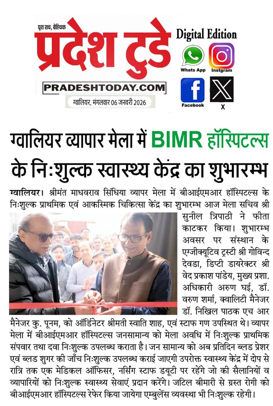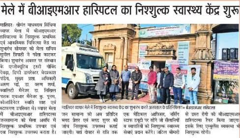 श्री मंत माधवराव सिंधिया व्यपार मेला में बीआईएमआर हॉस्पिटल के निःशुल्क प्राथमिक एवं आकस्मिक चिकित्सा केंद्र का शुभारम्भ दिनांक 05 जनवरी 2026 को मेला सचिव सुनील त्रिपाठी ने किया । इस दौरान बीआईएमआर हॉस्पिटल के एग्जीक्यूटिव ट्रस्टी गोविन्द देवड़ा, डिप्टी डायरेक्टर (ऑपरेशन) वेद प्रकाश पांडेय, मुख्या प्रशासनिक अधिकारी अरुण घई, डॉ. वरुण शर्मा, क़्वालिटी मैनेजर डॉ. निखिल पाठक, एच आर मैनेजर पूनम, कोऑर्डिनेटर स्वाति शाह एवं स्टाफगण उपस्थित रहे । व्यापर मेला में बीआईएमआर हॉस्पिटल के निःशुल्क प्राथमिक एवं आकस्मिक चिकित्सा केंद्र द्वारा जनसामान्य को मेला अवधि में निःशुल्क प्राथमिक उपचार एवं निःशुल्क दवा उपलब्ध कराइ जाएगी साथ ही मरीजों की बीपी व शुगर की जांच भी निःशुल्क की जाएगी । स्वास्थय केंद्र में दोपहर से रात तक एक मेडिकल ऑफिसर और नर्सिंग स्टाफ ड्यूटी पर रहेगा । जटिल बीमारी से ग्रस्त मरीजों को बी आई एम आर हॉस्पिटल रेफर किया जायेगा जिसके लिए एम्बुलेंस व्यवस्था भी निःशुल्क रहेगी ।