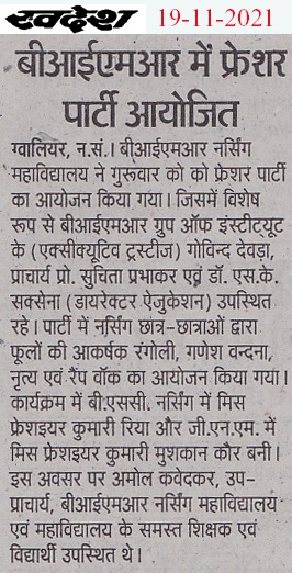 बीआईएमआर नर्सिंग कॉलेज में फ्रेशर पार्टी का आयोजन किया गया इस दौरान विद्यार्थियों ने गणेश वंदना, डांस एवं रैम्पवॉक में अपना हुनर दिखाया बीएससी नर्सिंग में रिया को मिस फ्रेशर एवं जीएनएम में मुस्कान को मिस फ्रेशर चुना गया कार्यक्रम में बीआईएमआर ग्रुप के एग्जीक्यूटिव ट्रस्टी गोविन्द देवड़ा, प्राचार्य सुचिता प्रभाकर, डॉ. एसके सक्सेना, अमोल कवेदकर मौजूद रहे