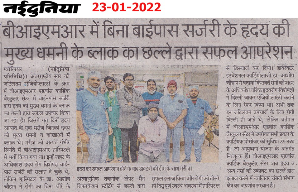 अंतर्राष्ट्रीय स्तर की जटिलतम D Angioplasty के क्रम में BIMR ADVANCE CARDIO VASCULAR CENTRE की एक और सफलता । गाठ दिनों ह्रदय आघात के एक मरीज जिनकी ह्रदय की मुख्य धमनी व शाखाओं मैं ब्लॉक थे । जिसके लिए शहर के अधिकांश ह्रदय रोग विशेषज्ञ केवल BYPASS SURGERY की सलाह दे चुके थे । मरीज को अत्यंत गंभीर स्थिति में बीआईएमआर हॉस्पिटल्स में भर्ती किया । डॉ. आशीष चौहान ने रोगी का बिना चीरे के अत्याधुनिक तकनीक (LEFT MAIN BIFURCATION STENDING ) से छल्ले द्वारा साफा ईलाज किया तथा रोगी को तीसरे ही दिन पूर्ण स्वस्थ अवस्था में हॉस्पिटल से डिस्चार्ज कर दिया । रोगी को आयुष्मान योजना के अंतर्गत पूरा उपचार निःशुल्क किया गया । उक्त रोगी को शहर के अधिकांश वरिष्ठ हृदयरोग विशेषज्ञों ने दिल्ली जाकर एंजियोप्लास्टी करने के लिये रेफर किया था । अभी तक इन जटिलतम उपचारों के लिये रोगी दिल्ली ही जाते थे ।
