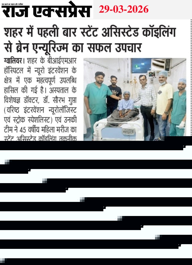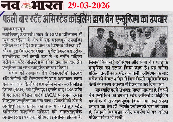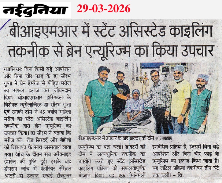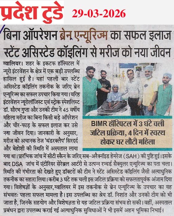 शहर के BIMR हॉस्पिटल में न्यूरो इंटरवेंशन के क्षेत्र में एक महत्वपूर्ण उपलब्धि हासिल की गई है। अस्पताल के विशेषज्ञ डॉक्टर, डॉ. सौरभ गुप्ता (वरिष्ठ इंटरवेंशन न्यूरोलॉजिस्ट एवं स्ट्रोक स्पेशलिस्ट) एवं उनकी टीम ने 45 वर्षीय महिला मरीज का स्टेंट असिस्टेड कॉइलिंग तकनीक द्वारा ब्रेन एन्यूरिज़्म का सफलतापूर्वक उपचार किया।