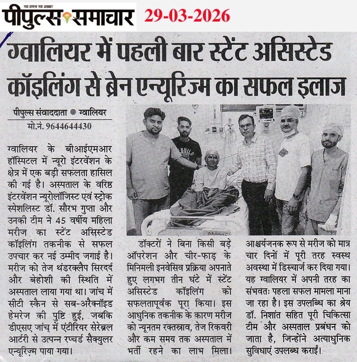 यह ग्वालियर में संभवतः पहला मामला है, जिसमें ब्रेन एन्यूरिज़्म का उपचार स्टेंट असिस्टेड कॉइलिंग तकनीक से सफलतापूर्वक किया गया।